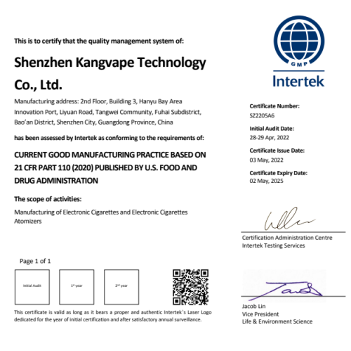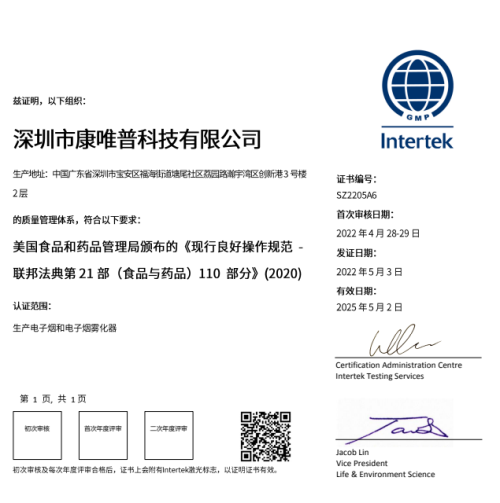祝賀深圳市康唯普科技有限公司2022年順利通過電子煙GMP 110認證