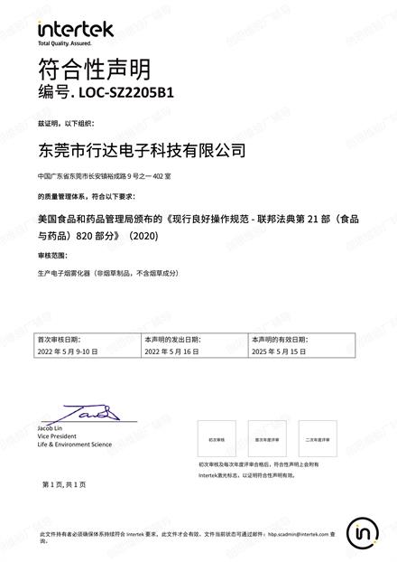 本文來源:驗廠之家 - 祝賀東莞市行達電子科技有限公司2022年順利通過電子煙GMP 820認證