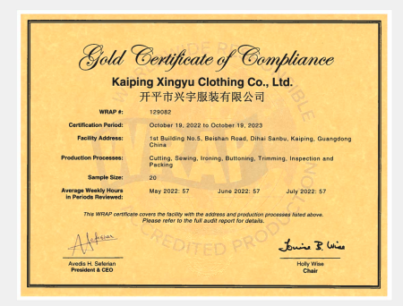 祝賀開平市興宇服裝有限公司2022年順利通過WRAP認(rèn)證