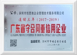 2017-2019年連續三年榮獲”廣東省守合同重信用企業“榮譽證書
