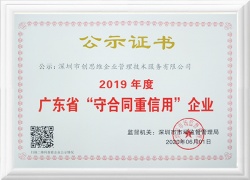 2019年榮獲”廣東省守合同重信用企業“榮譽證書